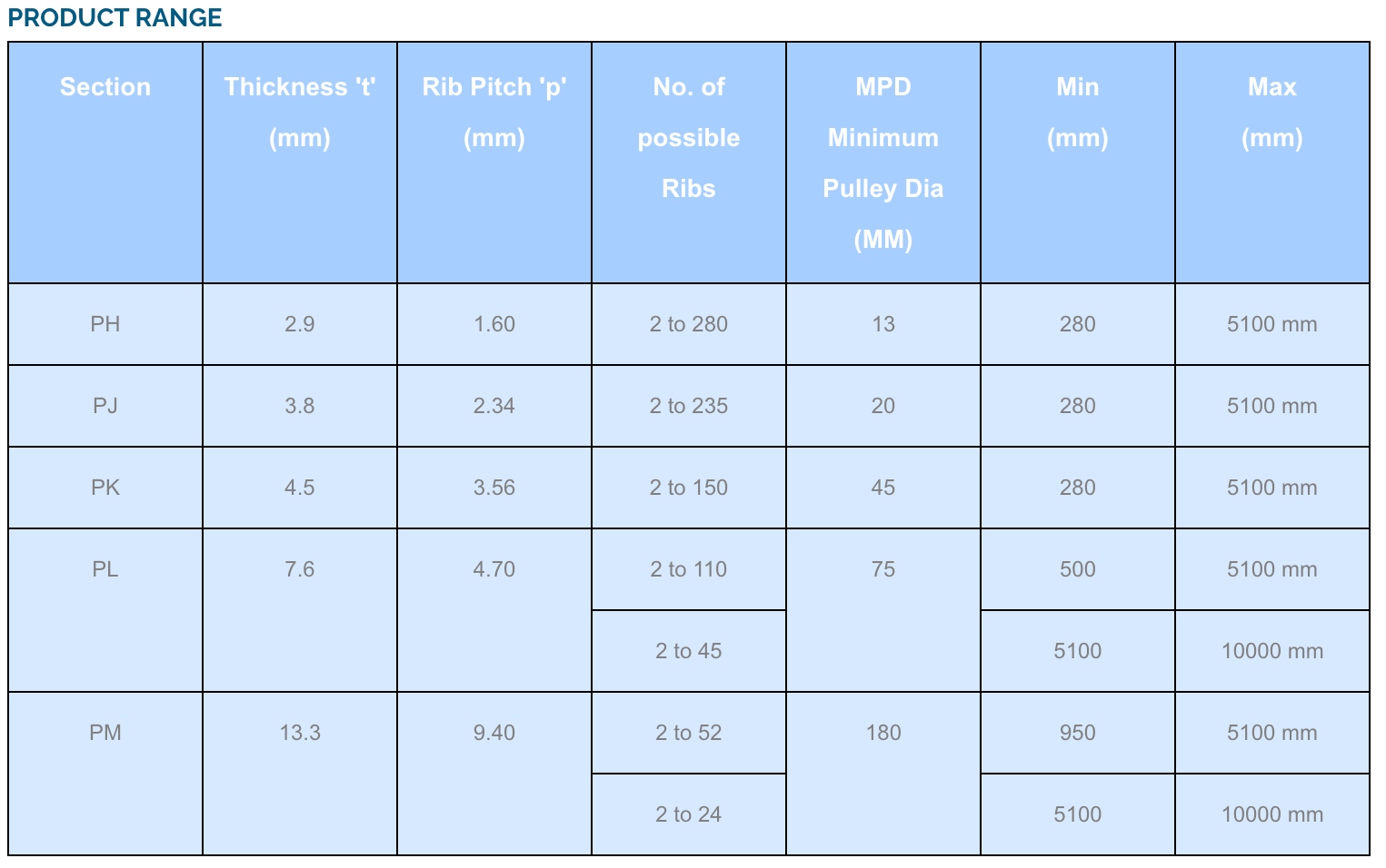 - PJ: up to 36 ribs, Length: 700 mm to 2000 mm