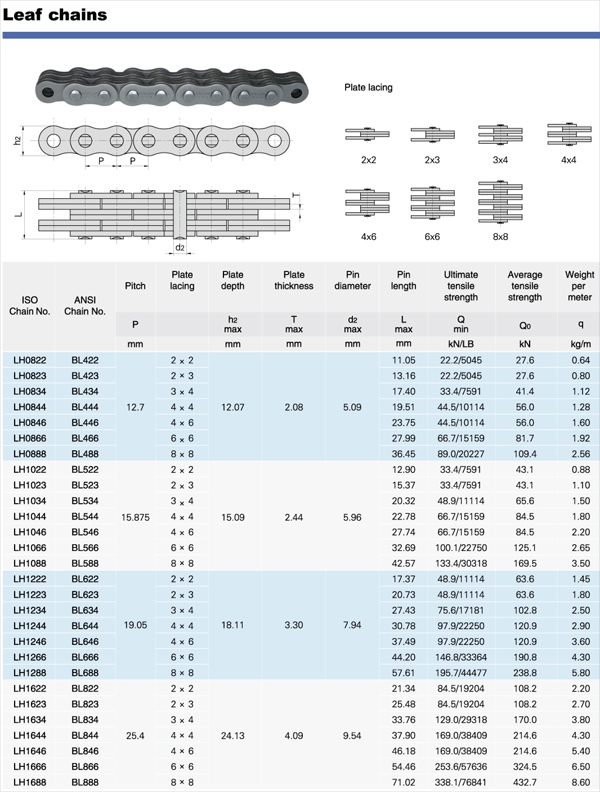 Leaf Chains, sometimes called cable chains or balance chains, consist of interlacing link plates and riveted pins. They are particularly suited for use in lift trucks