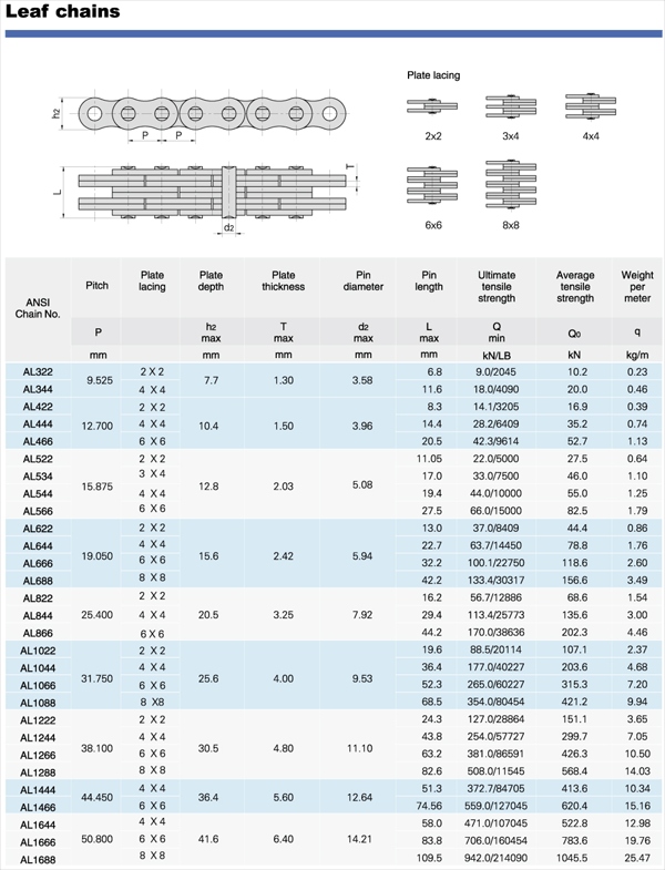 AL Series Leaf Chains consist of link plates of the same contour and thickness as the pin link plates of ANSI roller chains of the same pitch. The pins have the same diameter as those of ANSI roller chains of the same pitch.